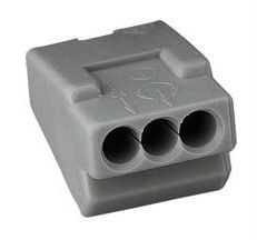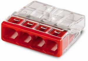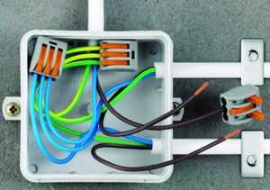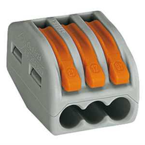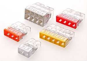 - многоразовые рычажные пружинные клеммы Wago. Очень компактно выполненный из изоляционного материала рычажок в состоянии «зажато» совершенно не выступает и не торчит над поверхностью. Это, вместе с обтекаемостью формы, делает такие зажимы весьма удобными для использования в местах, где нет излишка свободного места: в распределительных коробках, под крышками подвесных светильников и так далее. Зажимание происходит с помощью пружинно-кулачкового механизма, усилие которого рассчитано именно на создание надёжного контакта. Выпускаются такие клеммники на разное количество разветвляемых соединений. Аналогично предыдущим, можно использовать одножилки и многожилки, разные материалы (с пастой и без), также как выпускаются и под различные сечения проводов.
