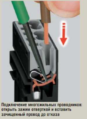 В-третьих, в процессе работы не придется пользоваться отверткой, как это происходит при установке «винтовых» клеммников и фиксации в них кончиков проводов. Кто работал в условиях слабой освещенности, при монтаже эл/проводки в труднодоступных местах, такое преимущество продукции «WAGO» оценит по достоинству.