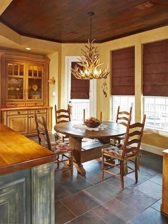 Шале не фокусирует внимание на изящных мелочах прованса. Принятые в этом стиле грубоватые, часто неровные формы деревянного массива, превращают в подвесные потолочные люстры самые обычные вещи: старые бочонки и стремянки, пчелиные улья, корзины для овощей или просто очищенное от коры бревно.