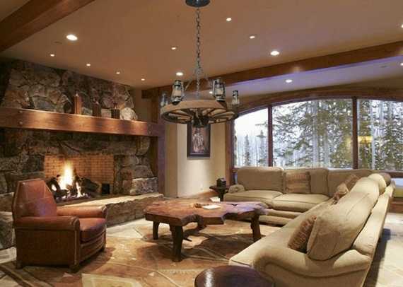 Комната с непременным для альпийского домика большим камином может освещаться светильниками, которым придана форма факелов на стене.