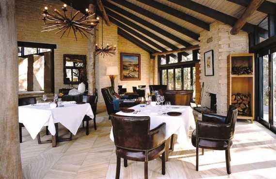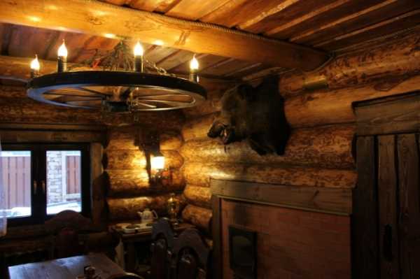 В таких интерьерах большие подвесные потолочные деревянные люстры выглядят естественно и выгодно их подчеркивают. Стену украсят бра из полупрозрачного среза смолистого кедра, изголовья кроватей осветят кованые напольные торшеры с резными вставками, оригинальные настольные лампы из необычной коряги совершенно уместны на рабочем столе, а нарядные абажуры из ткани будут дарить мягкий свет в спальне.