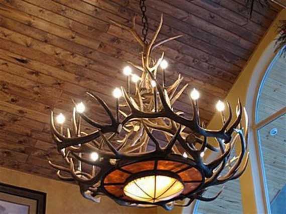 Рожки под светодиоды в простоватом и неприхотливом стиле шале изготавливают из самых настоящих рогов. Их снабжают абажурами и закрепляют на стене в качестве бра, с вмонтированной оптикой рога и причудливые корневища служат в качестве точечных светильников.