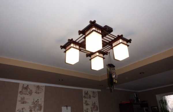 В интерьерах с восточной ноткой очень красивы изящные люстры из гнутого массива древесины, кованого и литого металла с фаянсовыми расписными плафонами.