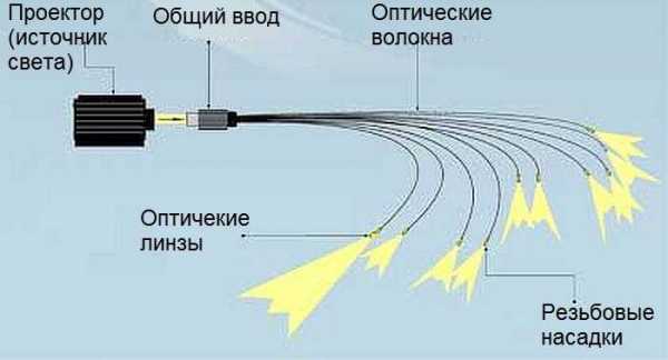 Главными элементами системы являются источник света, световолоконный провод разного сечения и рассеиватели-светильники.