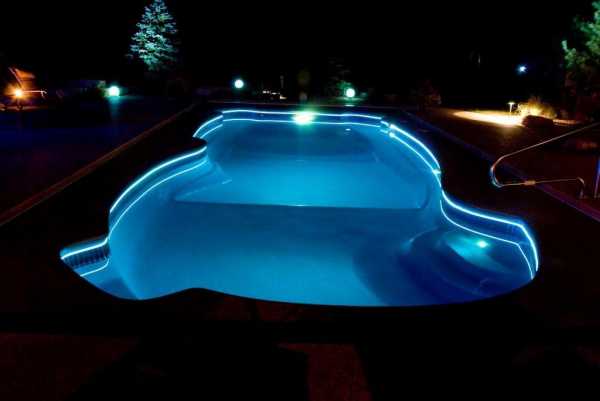 Если освещение сделано в комплексе от одного источника света, то в одно и то же время осуществляется смена цвета воды, периметра бассейна и подсветки находящегося вокруг ландшафта.