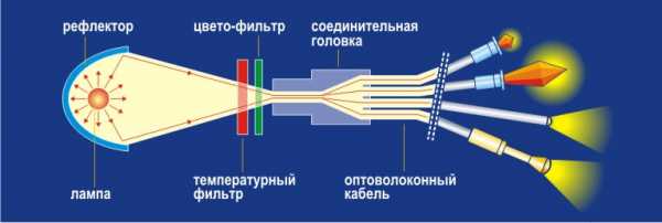 Принцип работы такого оборудования заключается в передаче света из проектора по пучкам гибких волокон с высоким коэффициентом преломления света.