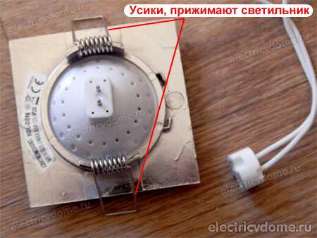 Технология монтажа очень простая: усики сводятся вместе, затем светильник вставляется в отверстие в потолке. Под действием пружин усики расходятся и плотно прижимают корпус к листу гипсокартона.