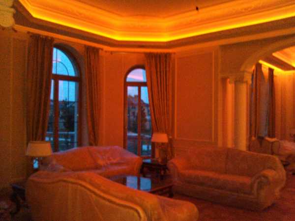 - Продолжая тему яркости, необходимо обязательно учесть степень естественной освещенности комнаты и преобладающий цвет. Часто в зале или гостиной достаточно света и без таких лент. В этом случае можно лишь частично установить подобный гаджет.