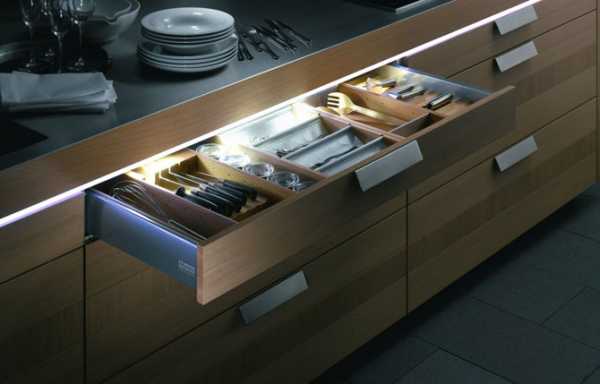 Самым простым и выгодным вариантом будет подсветка мебели светодиодной лентой своими руками. Тем более, сделана она будет в самых необходимых местах, самостоятельно можно выбирать расположение и интенсивность. Таким образом рабочая зона станет индивидуальной. С помощью подсветки между шкафами можно зрительно увеличить пространство.
