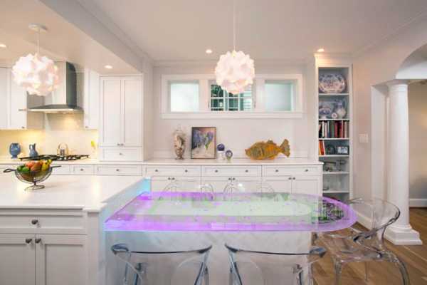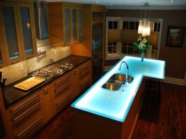 Другой вариант — скрытая светодиодная подсветка стеклянной столешницы. Источник света направляется с торца. Чтобы эффект был максимальным, столешница выполняется из прозрачного кварцевого стекла с нанесенными на поверхность матовыми деталями. Именно они и будут светиться
