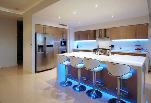 Диодная подсветка для кухни в зоне барной стойки направлена, как правило, вниз