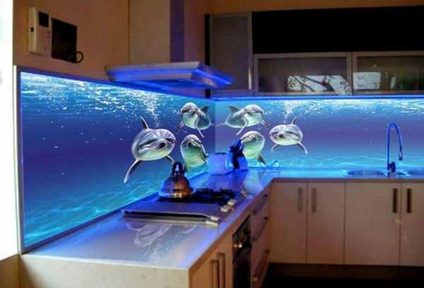 Светящаяся скиналь пришла в кухонный интерьер из рекламного освещения. Это плоская диодная панель с нанесенным на молочное стекло изображением