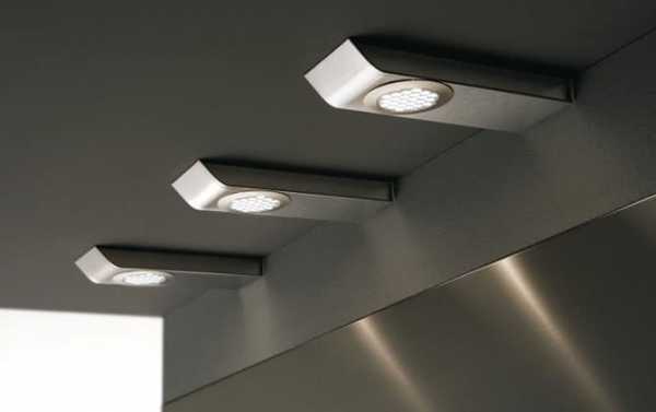 - Врезные светильники, линейные и точечные. Будучи весьма тонкими, монтируются в нижнюю полку шкафчика заподлицо с нижней поверхностью.